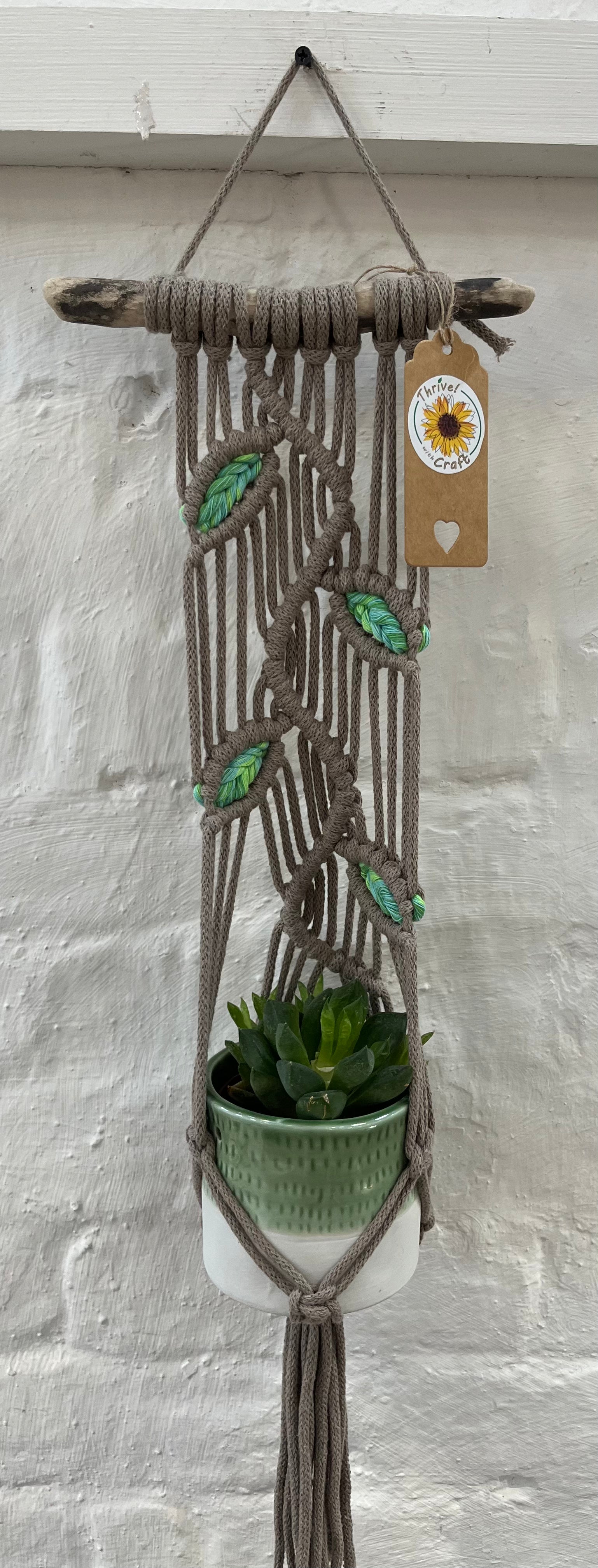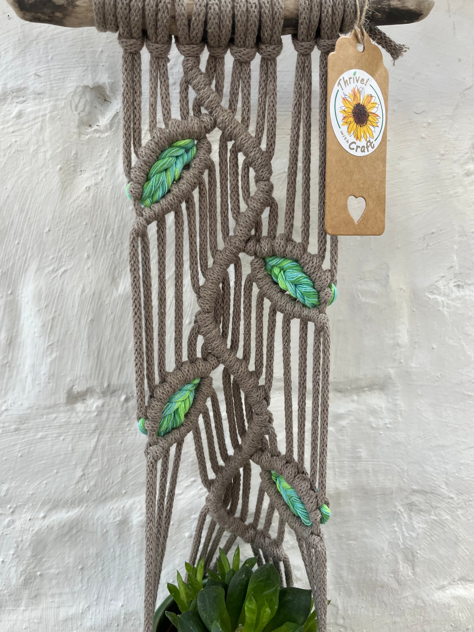 The Peony is a wall mount hanger with gorgeous leaf detailing. Accented with rescued "mojito" cord this hanger is made from recycled cotton cord and locally (Cornish) beach combed driftwood.